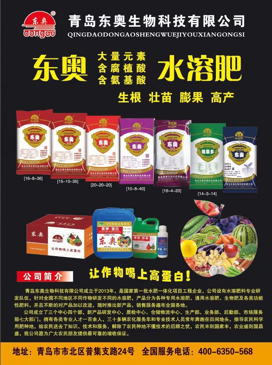 青岛东奥生物科技有限公司成立于2014年,是国家第一批水肥一体化项目工程企业,公司设有水溶肥料专业研发队伍,针对全国不同地区不同作物研发不同的水溶肥,产品分为各种专用水溶肥、通用水溶肥、生物肥及各类功能性肥料,并且不断的对产品加以改进,随时推出新产品,销售服务遍布全国各地。